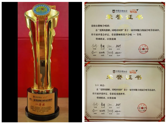 贵阳市教师合唱团多次荣获国际、国内和省、市各级别大奖,并于2016年10月成功举办京筑艺术教育交流暨建团20周年合唱音乐会,曾获第二届全国教师合唱节演唱金奖、优秀指挥奖、优秀伴奏奖和新作品创作奖;第三届中国(南充)嘉陵江合唱艺术节演唱金奖;第十二届中国合唱节演唱金奖、优秀新作品奖;第三届全国教师合唱节获演唱金奖、优秀指挥奖和新作品创作奖;第五届内蒙古(锡林浩特)合唱比赛演唱金奖、优秀指挥奖、优秀伴奏奖;第二届海南(21世纪海上丝绸之路)演唱金奖、优秀指挥奖。2021年第十一届中国魅力校园合唱节演唱一等奖第一名,优秀指挥奖。贵阳市总工会举办的“永远跟党走,聚力强省会”合唱比赛,以第一名的成绩获得特别奖。