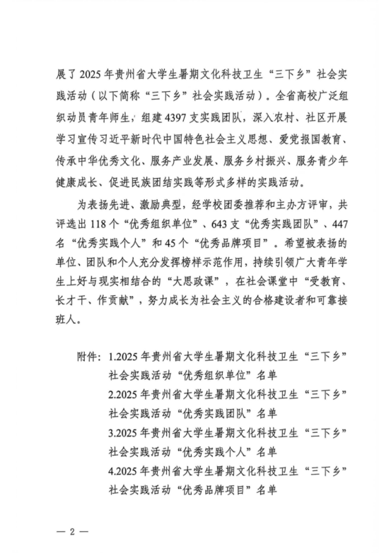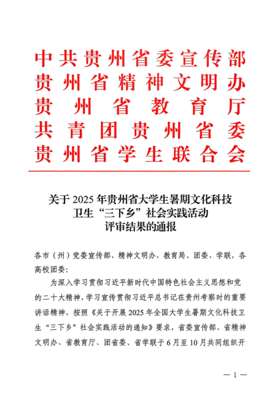 2025年大学生暑期“三下乡”社会实践活动省级评选结果公布。经学校团委推荐、主办方审核,共评审出118个“优秀实践单位”,643个“优秀实践团队”,447名“优秀个人”和45个“优秀品牌项目”。我校共获省级奖项11项,其中“优秀组织单位”1个、“优秀实践团队”5支、“优秀个人”4名、“优秀品牌项目”1支。